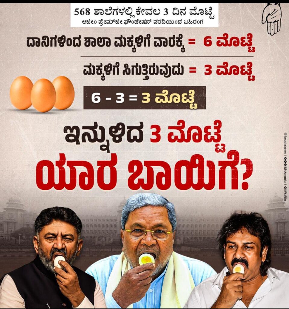 ರಾಜ್ಯದ 568 ಶಾಲೆಗಳಲ್ಲಿ ಮಕ್ಕಳಿಗೆ ವಾರಕ್ಕೆ ಮೂರು ದಿನವಷ್ಟೇ ಮಕ್ಕಳಿಗೆ ಮೊಟ್ಟೆ ನೀಡಲಾಗುತ್ತಿದೆ ಎಂಬ ಮಾಹಿತಿ ಅಜೀಂ ಪ್ರೇಂಜಿ ಫೌಂಡೇಶನ್ ವರದಿಯಿಂದ ಬಹಿರಂಗವಾಗಿದೆ. ಈ ವಿಷಯವನ್ನಿಟ್ಟುಕೊಂಡು ಆರರಲ್ಲಿ ಮೂರು ಮೊಟ್ಟೆಗಳು ಮಕ್ಕಳಿಗೆ, ಉಳಿದ ಮೂರು ಮೊಟ್ಟೆಗಳು ಯಾರ ಬಾಯಿಗೆ ಹೋಗುತ್ತಿದೆ ಎಂದು ಕಾಂಗ್ರೆಸ್ ಸರ್ಕಾರದ ವಿರುದ್ಧ ಬಿಜೆಪಿ ತನ್ನ ಎಕ್ಸ್ ಖಾತೆಯ ಮೂಲಕ ಪ್ರಶ್ನೆ ಮಾಡಿದೆ.