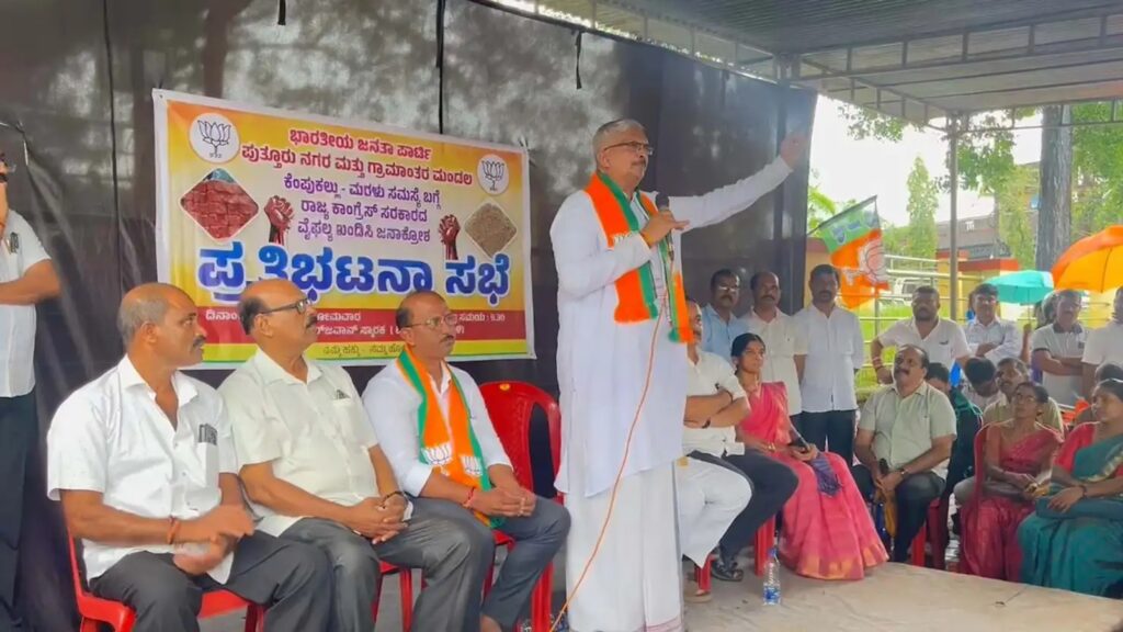 ಕೆಂಪುಕಲ್ಲು ಮತ್ರು ಮರಳು ಅಭಾವದ ವಿರುದ್ಧ ಪುತ್ತೂರಿನ ಅಮರ್ ಜವಾನ್ ಸ್ಮಾರಕದ ಬಳಿ ಸೋಮವಾರ ನಡೆದ ಪ್ರತಿಭಟನೆಯಲ್ಲಿ ಅವರು ಮಾತನಾಡಿದರು.