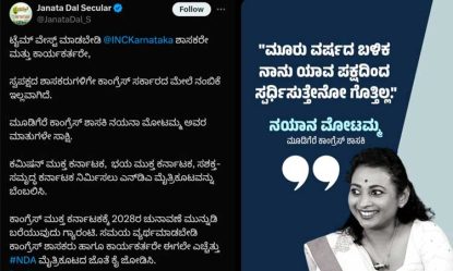 ಕಾಂಗ್ರೆಸ್ ಶಾಸಕರಿಗೆ ಕಾಂಗ್ರೆಸ್ ಸರ್ಕಾರದ ಮೇಲೆ ನಂಬಿಕೆ ಇಲ್ಲ. ಅದಕ್ಕೆ ನಯನಾ ಮೋಟಮ್ಮ ಅವರ ಮಾತುಗಳು ಸಾಕ್ಷಿ. ಕಾಂಗ್ರೆಸಿಗರೇ ಸಮಯ ವ್ಯರ್ಥ ಮಾಡದೆ ಎನ್ಡಿಎ ಮೈತ್ರಿಕೂಟಕ್ಕೆ ಬೆಂಬಲ ನೀಡಿ ಎಂದು ಹೇಳಿದೆ.