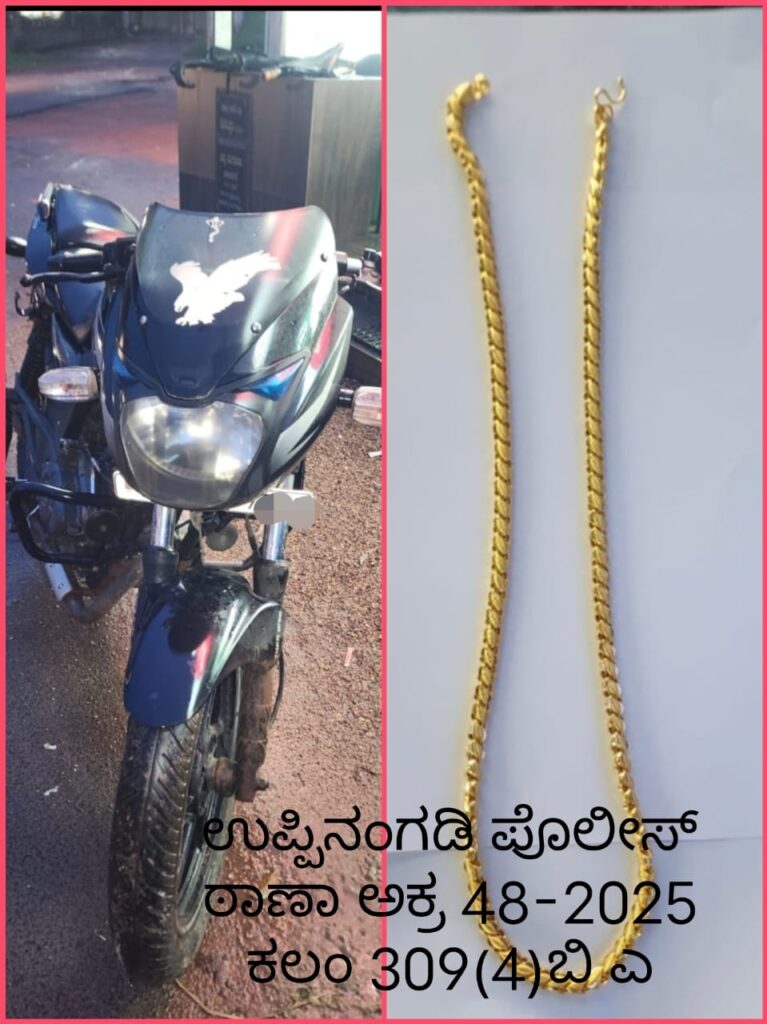 ಪೊಲೀಸ್ ಠಾಣಾ ವ್ಯಾಪ್ತಿಯ ನೆಲ್ಯಾಡಿ, ಪಡುಬೆಟ್ಟು ಎಂಬಲ್ಲಿ ಜೂ.4ರಂದು ಮಹಿಳೆಯೊಬ್ಬರ ಕುತ್ತಿಗೆಯಲ್ಲಿದ್ದ ಚಿನ್ನದ ಸರವನ್ನು ಬೈಕಿನಲ್ಲಿ ಬಂದಿದ್ದ ಇಬ್ಬರು ಅಪರಿಚಿತರು ಎಳೆದು ಬಲವಂತವಾಗಿ ಕಸಿದುಕೊಂಡು ಹೋದ ಘಟನೆಗೆ ಸಂಬಂಧಿಸಿದಂತೆ ಉಪ್ಪಿನಂಗಡಿ ಪೊಲೀಸ್ ಠಾಣೆಯಲ್ಲಿ ಪ್ರಕರಣ ದಾಖಲಾಗಿತ್ತು.