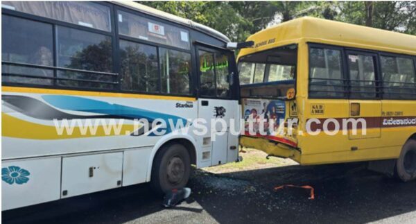 ಪುತ್ತೂರು: ಶಾಲಾ ಬಸ್ಸಿಗೆ ಖಾಸಗಿ ಬಸ್ಸೊಂದು ಹಿಂದಿನಿಂದ ಡಿಕ್ಕಿ ಹೊಡೆದ ಘಟನೆ ಪುಣಚದ ಮಲ್ಲಿಕಟ್ಟೆ ಎಂಬಲ್ಲಿ ಇಂದು ಬೆಳಗ್ಗೆ ನಡೆದಿದೆ.