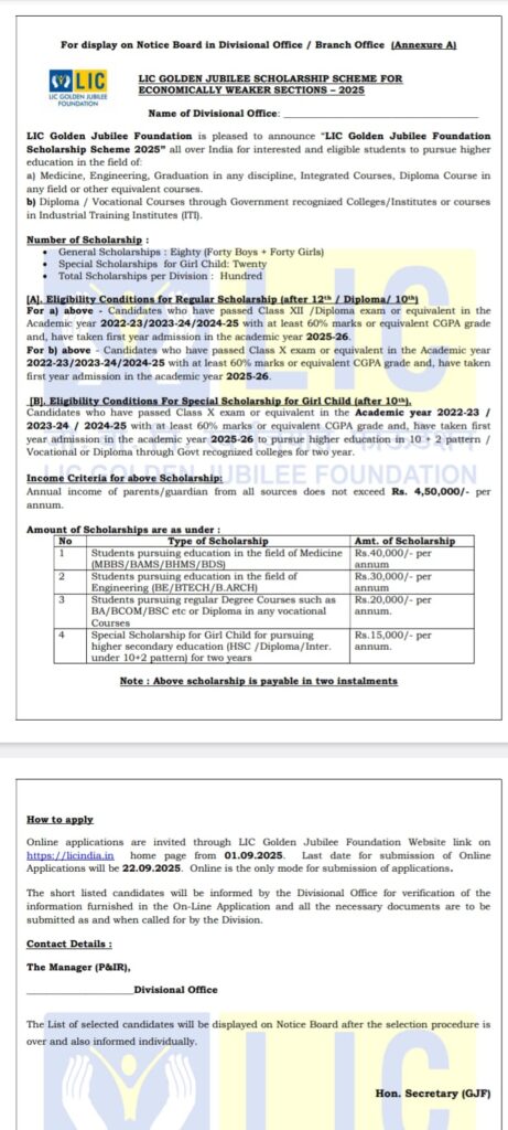 ಎಲ್ಐಸಿ ಸುವರ್ಣ ಮಹೋತ್ಸವ್ ಪ್ರತಿಷ್ಠಾನವು ಭಾರತದಾದ್ಯಂತ ಎಲ್ ಐಸಿ ಸುವರ್ಣ ಮಹೋತ್ಸವ ಅಂಗವಾಗಿ 2025 ರ ವಿದ್ಯಾರ್ಥಿವೇತನ ಯೋಜನೆಯನ್ನು ಘೋಷಿಸಲು ಸಂತೋಷಪಡುತ್ತಿದೆ.