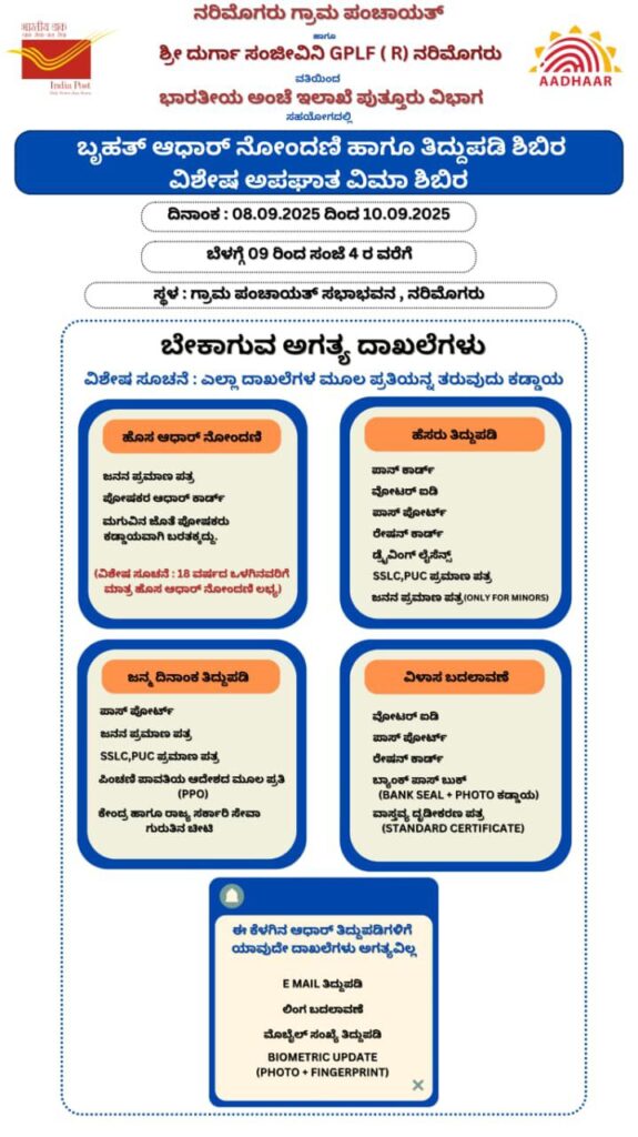 ಪುತ್ತೂರು: ನರಿಮೊಗರು ಗ್ರಾಮ ಪಂಚಾಯಿತಿ ಹಾಗೂ ನರಿಮೊಗರು ಶ್ರೀ ದುರ್ಗಾ ಸಂಜೀವಿನಿ ಜಿಪಿಎಲ್ ಎಫ್ ವತಿಯಿಂದ ಭಾರತೀಯ ಅಂಚೆ ಇಲಾಖೆ ಪುತ್ತೂರು ವಿಭಾಗದ ಸಹಯೋಗದಲ್ಲಿ ಬೃಹತ್ ಆಧಾರ್ ನೋಂದಣಿ ಹಾಗೂ ತಿದ್ದುಪಡಿ ಶಿಬಿರ ಹಾಗೂ ವಿಶೇಷ ಅಪಘಾತ ವಿಮಾ ಶಿಬಿರ ಸೆ.8 ರಿಂದ 10 ರ ತನಕ ನರಿಮೊಗರು ಗ್ರಾಮ ಪಂಚಾಯಿತಿ ಸಭಾಂಗಣದಲ್ಲಿ ನಡೆಯಲಿದೆ.