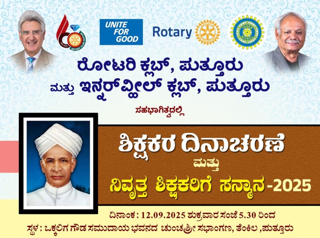 ಪುತ್ತೂರು: ರೋಟರಿ ಕ್ಲಬ್ ಪುತ್ತೂರು ಹಾಗೂ ಇನ್ನರ್ ವ್ಹೀಲ್ ಕ್ಲಬ್ ಸಹಭಾಗಿತ್ವದಲ್ಲಿ ಶಿಕ್ಷಕರ ದಿನಾಚರಣೆ ಮತ್ತು ನಿವೃತ್ತ ಶಿಕ್ಷಕರಿಗೆ ಸನ್ಮಾನ ಇಂದು (ಶುಕ್ರವಾರ) ಸಂಜೆ 5.30 ಕ್ಕೆ ತೆಂಕಿಲ ಒಕ್ಕಲಿಗ ಗೌಡ ಸಮುದಾಯ ಭವನದಲ್ಲಿ ನಡೆಯಲಿದೆ.