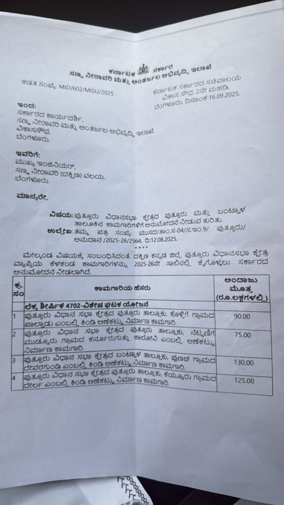 ಕೊಳ್ತಿಗೆ ಗ್ರಾಮದ ಪಾಲ್ತಾಡಿಗೆ ರೂ 90 ಲಕ್ಷ ,ನೆಟ್ಟಣಿಗೆ ಮುಡ್ನೂರು ಗ್ರಾಮದ ಕರ್ನೂರು ಗುತ್ತು ಕಾಲನಿ 70 ಲಕ್ಷ,ಬಂಟ್ವಾಳ ತಾಲೂಕು ಪುಣಚಾ ಗ್ರಾಮದ ದೇವರ ಗುಂಡಿ ಬಳಿ ಕಿಂಡಿ ಅಣೆಕಟ್ಟು ನಿರ್ಮಾಣ 130 ಲಕ್ಷ, ಕೆಯ್ಯೂರು ಗ್ರಾಮದ ದೇರ್ಲದಲ್ಲಿ ಕಿಂಡಿಅಣೆಕಟ್ಟು ನಿರ್ಮಾಣ ರೂ 125 ಲಕ್ಷ ಹಾಗೂ ಬಂಟ್ವಾಳ ತಾಲೂಕು ವಿಟ್ಲ ಗ್ರಾಮದ ನೆಕ್ಕಿಕಾರ್ ನಲ್ಲಿ ಕಿಂಡಿಅಣೆಕಟ್ಟು ನಿರ್ಮಾಣಕ್ಕೆ 150 ಲಕ್ಷ ರೂ ಅನುದಾನ ಮಂಜೂರಾಗಿರುತ್ತದೆ.