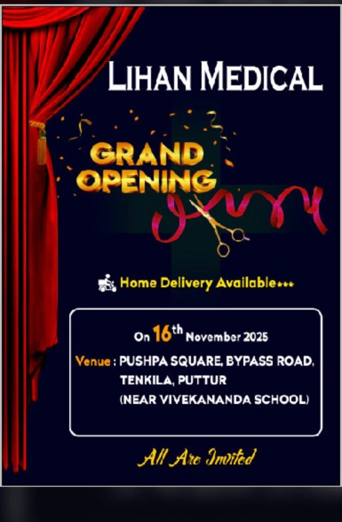 ಪುತ್ತೂರು: ಹರ್ಷಿತ್ ಮತ್ತು ಕೃತಿ ಅವರ ಮಾಲಕತ್ವದಲ್ಲಿ ಪುಷ್ಪಾ ಸ್ಕ್ವೇರ್, ಬೈಪಾಸ್, ತೆಂಕಿಲದಲ್ಲಿ (ವಿವೇಕಾನಂದ ಶಾಲೆಯ ಸಮೀಪ) ನೂತನ ಔಷಧ ಅಂಗಡಿ ಲಿಹಾನ್ ಮೆಡಿಕಲ್ ನವೆಂಬರ್ 16 ರಂದು ಶುಭಾರಂಭವಾಗಲಿದೆ.