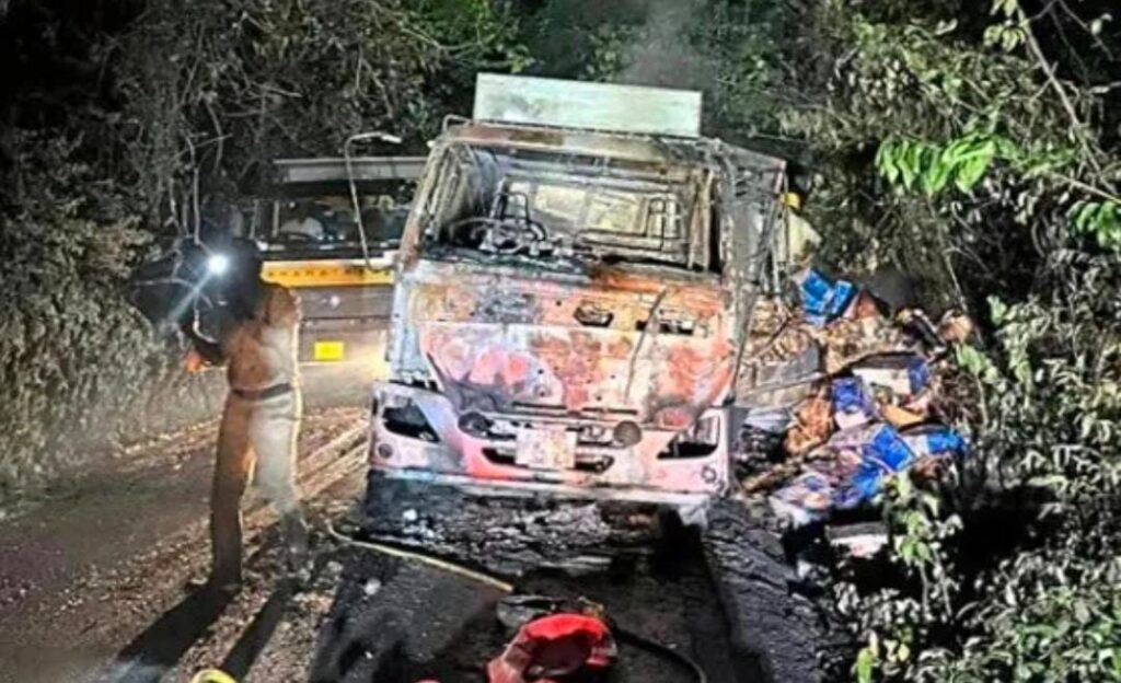 ಕಾರ್ಕಳ: ಕುದುರೆಮುಖ – ಮಾಳ ರಸ್ತೆಯಲ್ಲಿ ಕಾಶ್ಮೀರದಿಂದ ಮಂಗಳೂರಿಗೆ ಸೇಬು ಹಣ್ಣುಗಳನ್ನು ರವಾನೆ ಮಾಡುತ್ತಿದ್ದ ಲಾರಿಯೊಂದು ಟೈರ್ ಸ್ಪೋಟಗೊಂಡ ಪರಿಣಾಮ ಹೊತ್ತಿ ಉರಿದ ಘಟನೆ ನಡೆದಿದೆ. ಚಾಲಕ ಮತ್ತು ಸಹಾಯಕ ಅಪಾಯದಿಂದ ಪಾರಾಗಿದ್ದಾರೆ.