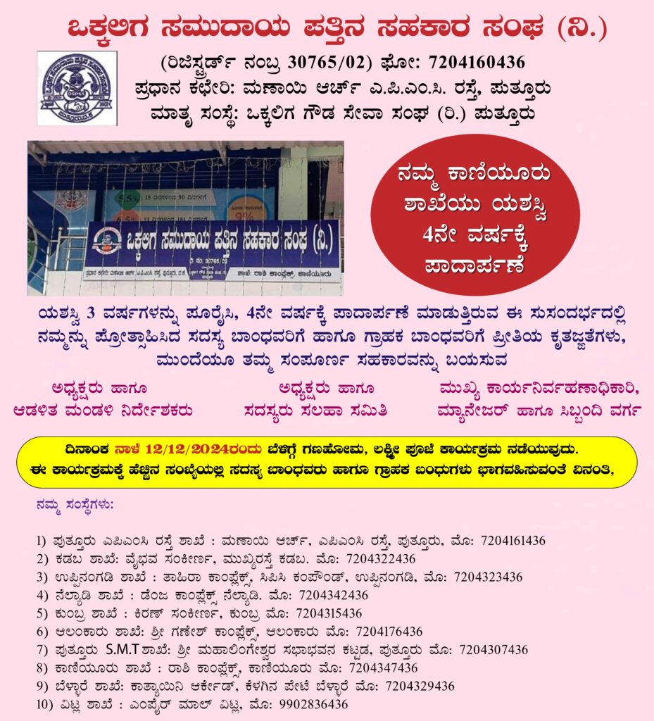 ಪುತ್ತೂರು: ಒಕ್ಕಲಿಗ ಸಮುದಾಯ ಪತ್ತಿನ ಸಹಕಾರಿ ಸಂಘ (ನಿ.) ದ ಕಾಣಿಯೂರು ಶಾಖೆಯು ಮೂರು ವರ್ಷಗಳನ್ನು ಯಶಸ್ವಿಯಾಗಿ ಪೂರೈಸಿ ನಾಲ್ಕನೇ ವರ್ಷಕ್ಕೆ ಪಾದಾರ್ಪಣೆ ಮಾಡುತ್ತಿದೆ.