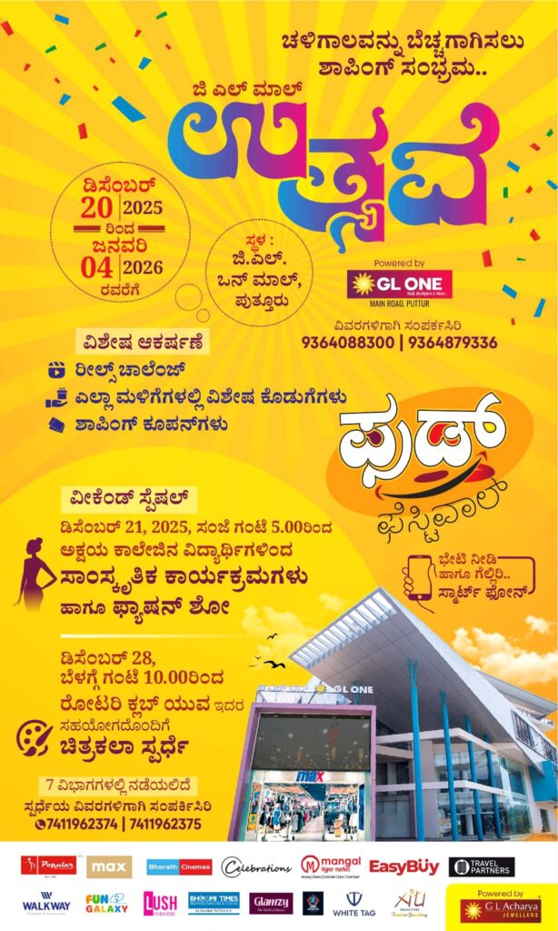 ಪುತ್ತೂರು: ನಗರದ ಜಿ. ಎಲ್.‌ಮಾಲ್ ನಲ್ಲಿ ಚಳಿಗಾಲದ ವಿಶೇಷ ಎಂಬಂತೆ ಶಾಪಿಂಗ್ ಪ್ರೇಮಿಗಳಿಗೆ ಮತ್ತು ಆಹಾರ ಪ್ರಿಯರಿಗೆ ಡಿ. 20 ರಿಂದ ಜ. 4 ರ ವರೆಗೆ ‘ಜಿ. ಎಲ್. ಮಾಲ್’ ಉತ್ಸವ ಮತ್ತು ‘ಫುಡ್ ಫೆಸ್ಟಿವಲ್’ ಅನ್ನು ಆಯೋಜಿಸಲಾಗಿದೆ.