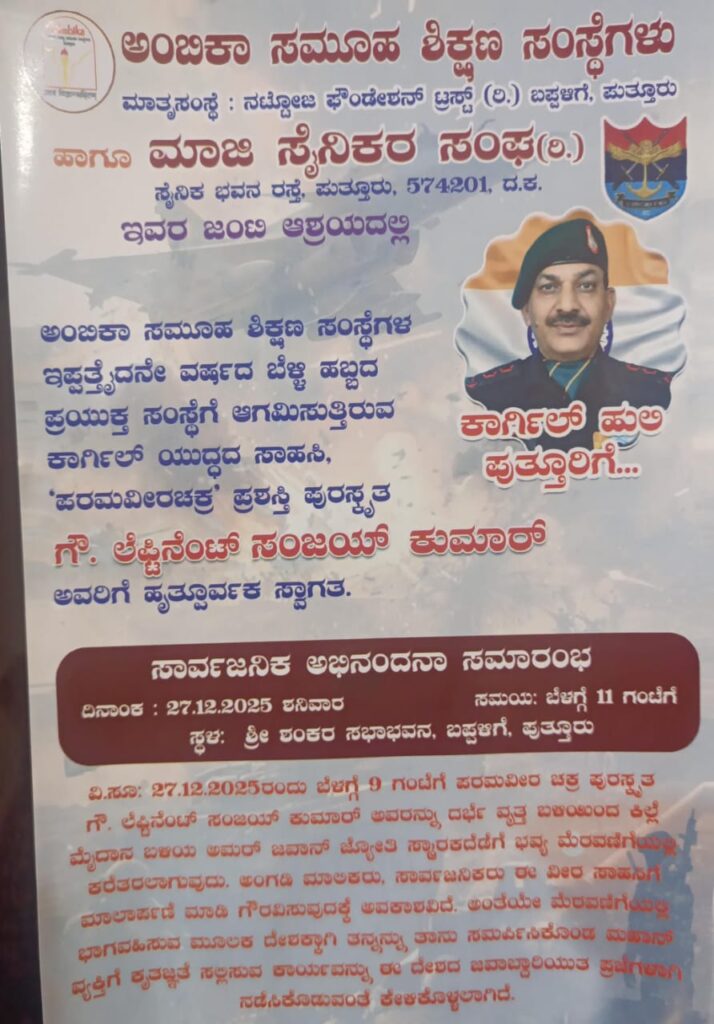 ಪುತ್ತೂರು: ಅಂಬಿಕಾ ಸಮೂಹ ಶಿಕ್ಷಣ ಸಂಸ್ಥೆಯ ಬೆಳ್ಳಿ ಹಬ್ಬದ ಪ್ರಯುಕ್ತ ,ಪುತ್ತೂರಿನ ಮಾಜಿ ಸೈನಿಕರ ಸಂಘದ ಸಹಯೋಗದಲ್ಲಿ ಪರಮವೀರಚಕ್ರ ಪುರಸ್ಕೃತ ಕಾರ್ಗಿಲ್ ಹುಲಿ, ವೀರ ಯೋಧ ಗೌ. ಲೆ. ಸಂಜಯ್ ಕುಮಾರ್ ಅವರಿಗೆ ಸಾರ್ವಜನಿಕ ಅಭಿನಂದನಾ ಸಭೆ ಡಿ. 27 ರಂದು ಬಪ್ಪಳಿಗೆಯ ಶ್ರೀ ಶಂಕರ ಸಭಾಭವನದಲ್ಲಿ ನಡೆಯಲಿದೆ.