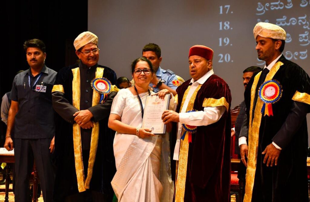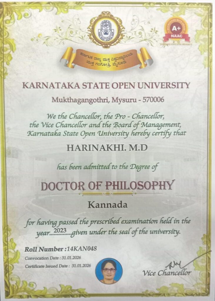 ಮುಕ್ತ ಗಂಗೋತ್ರಿ, ಮೈಸೂರು: ಕರ್ನಾಟಕ ರಾಜ್ಯ ಮುಕ್ತ ವಿಶ್ವ ವಿದ್ಯಾನಿಲಯದ 21ನೆ ಘಟಿಕೋತ್ಸವದಲ್ಲಿ ಡಾ. ಹರಿಣಾಕ್ಷಿ ಎಂ. ಡಿ. ಯವರು ಕರ್ನಾಟಕ ರಾಜ್ಯದ ಘನತೆವೆತ್ತ ರಾಜ್ಯಪಾಲರಾದ ಥಾವರ್’ಚಂದ್ ಗೆಹ್ಲೋಟ್ ಅವರಿಂದ Ph.D. ಪದವಿ ಪ್ರಮಾಣಪತ್ರವನ್ನು (Convocation Certificate) ಸ್ವೀಕರಿಸಿದರು.