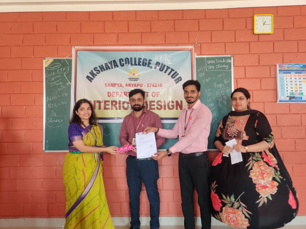 ಪುತ್ತೂರು: ಅಕ್ಷಯ ಎಜುಕೇಶನಲ್ ಮತ್ತು ಚಾರಿಟೇಬಲ್ ಟ್ರಸ್ಟ್ (ರಿ.) ಅಧೀನದಲ್ಲಿ ಕಾರ್ಯಾಚರಿಸುತ್ತಿರುವ ಅಕ್ಷಯ ಕಾಲೇಜಿನಲ್ಲಿ “ಎಲೈಟ್” ಆಂತರಿಕ ವಿನ್ಯಾಸ ಸಂಘ ಹಾಗೂ ಐಕ್ಯೂಎಸಿ ಸಹಭಾಗಿತ್ವದಲ್ಲಿ ಆಂತರಿಕ ವಿನ್ಯಾಸ ವಿಭಾಗದ ವಿದ್ಯಾರ್ಥಿಗಳಿಗೆ “ಆರ್ಥಿಕ ಸಾಕ್ಷರತೆ” ಎಂಬ ವಿಷಯದ ಕುರಿತು ಮಾಹಿತಿ ಕಾರ್ಯಾಗಾರ ನಡೆಸಲಾಯಿತು.