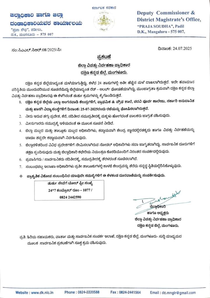 ದಕ್ಷಿಣ ಕನ್ನಡದಲ್ಲಿ ಭಾರೀ ಮಳೆ: ಜುಲೈ 25 ರಂದು ಶಾಲಾ ಕಾಲೇಜುಗಳಿಗೆ ರಜೆ