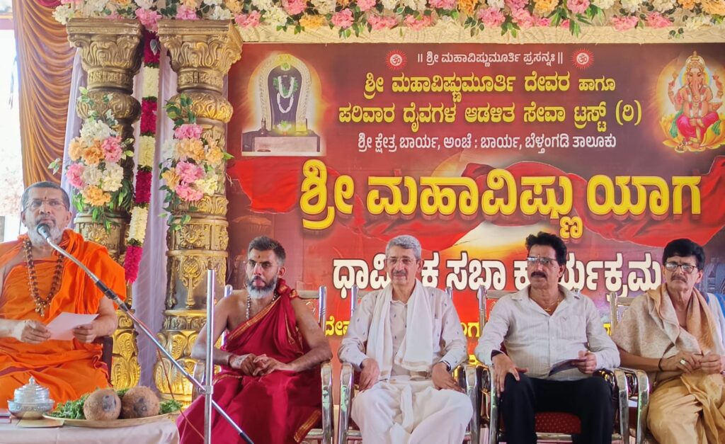 ಉಪ್ಪಿನಂಗಡಿ: ಧಾರ್ಮಿಕ ಕೇಂದ್ರಗಳಲ್ಲಿ ನಡೆಯುವ ಯಜ್ಞ ಯಾಗಾದಿಗಳು ಆ ಕ್ಷೇತ್ರಕ್ಕೆ ಮಾತ್ರ ಸಂಬಂಧಪಡದೆ ಲೋಕ ಕಲ್ಯಾಣದ ದೃಷ್ಟಿಯಿಂದ ನಡೆಯುತ್ತದೆ. ಎಲ್ಲಾ ಭೇದ ಭಾವವನ್ನು ಮರೆತು ನಾವು ಮಾಡುವ ಪ್ರಾರ್ಥನೆಯಿಂದ ಸಮಾಜಕ್ಕೆ ಭಗವದನುಗ್ರಹ ಪ್ರಾಪ್ತಿಯಾಗುತ್ತದೆ ಎಂದು ಎಡನೀರು ಮಠದ ಶ್ರೀ ಸಚ್ಚಿದಾನಂದ ಭಾರತಿ ಸ್ವಾಮಿಗಳು ಆಶೀರ್ವಚನದಲ್ಲಿ ತಿಳಿಸಿದರು. ಬಾರ್ಯ ಶ್ರೀ ಮಹಾವಿಷ್ಣು ದೇವಸ್ಥಾನದಲ್ಲಿ ಜರಗಿದ ಶ್ರೀ ಮಹಾವಿಷ್ಣುಯಾಗ ಸಂದರ್ಭದಲ್ಲಿ ದೇವಸ್ಥಾನದ ಹೊರಾಂಗಣಕ್ಕೆ ಶಾಶ್ವತ ಮೇಲ್ಚಾವಣಿ ಅಳವಡಿಸುವ ಕಾರ್ಯಕ್ಕೆ ಅವರು ಚಾಲನೆಯನ್ನು ನೀಡಿದರು. ಬಾರ್ಯ ಶ್ರೀ ಪಾಂಡುರಂಗ ಭಜನಾ ಮಂದಿರದ